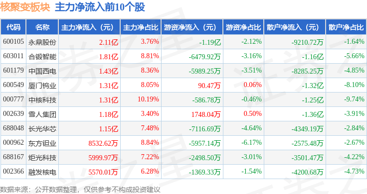 从资金流向上来看,当日核聚变板块主力资金净流入5270.27万元,游资资金净流出2.73亿元,散户资金净流入2.2亿元。核聚变板块个股资金流向见下表: