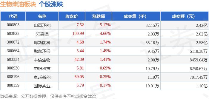 证券之星消息,1月5日生物柴油板块较上一交易日上涨1.86%,山高环能领涨。当日上证指数报收于4023.42,上涨1.38%。深证成指报收于13828.63,上涨2.24%。生物柴油板块个股涨跌见下表: