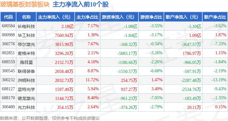 从资金流向上来看,当日玻璃基板封装板块主力资金净流入3.64亿元,游资资金净流出4.2亿元,散户资金净流入5560.43万元。玻璃基板封装板块个股资金流向见下表: