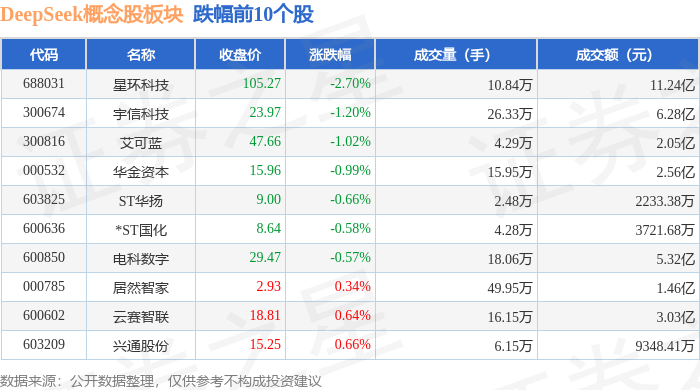 从资金流向上来看,当日DeepSeek概念股板块主力资金净流入16.88亿元,游资资金净流出7.04亿元,散户资金净流出9.84亿元。DeepSeek概念股板块个股资金流向见下表: