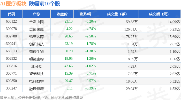 从资金流向上来看,当日AI医疗板块主力资金净流入24.71亿元,游资资金净流出18.2亿元,散户资金净流出6.51亿元。AI医疗板块个股资金流向见下表: