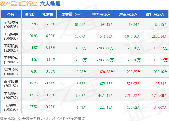 个股表现方面,农产品加工行业当日领跌股为京粮控股(000505),该股当日报收7.95,下跌6.58%,成交量61.48万,主力资金净流入395.49万元。国投中鲁(600962)以下跌4.56%紧随其后,该股当日成交量13.07万,主力资金净流出541.58万元。除此之外,田野股份(920023)、田野股份(920023)、深粮控股(000019)均进入当日熊股之列。具体个股列表见下表: