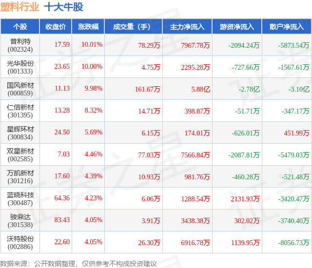 个股表现方面,塑料行业当日领涨股为普利特(002324),该股当日报收17.59,上涨10.01%,成交量78.29万,主力资金净流入7967.78万元。光华股份(001333)以上涨10.0%紧随其后,该股当日成交量4.75万,主力资金净流入2295.28万元。除此之外,国风新材(000859)、仁信新材(301395)、星辉环材(300834)均进入当日牛股之列。具体个股列表见下表: