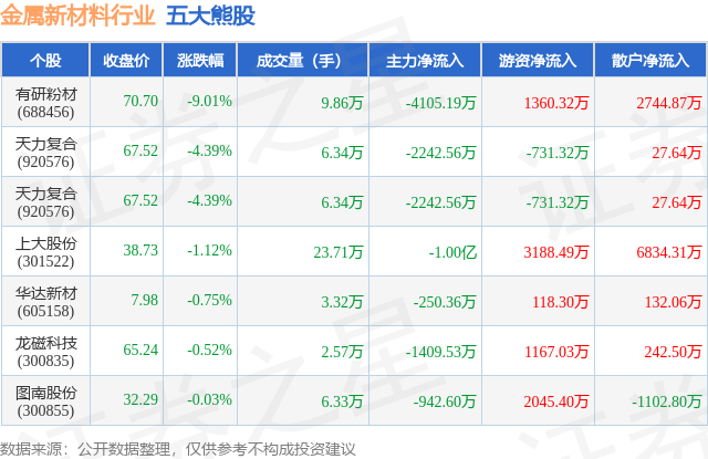 个股表现方面,金属新材料行业当日领跌股为有研粉材(688456),该股当日报收70.7,下跌9.01%,成交量9.86万,主力资金净流出4105.19万元。天力复合(920576)以下跌4.39%紧随其后,该股当日成交量6.34万,主力资金净流出2242.56万元。除此之外,天力复合(920576)、上大股份(301522)、华达新材(605158)均进入当日熊股之列。具体个股列表见下表: