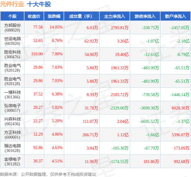 个股表现方面,元件行业当日领涨股为方邦股份(688020),该股当日报收77.58,上涨14.05%,成交量6.03万,主力资金净流入2795.81万元。世运电路(603920)以上涨8.76%紧随其后,该股当日成交量62.92万,主力资金净流入3.26亿元。除此之外,胜宏科技(300476)、胜业电气(920128)、胜业电气(920128)均进入当日牛股之列。具体个股列表见下表: