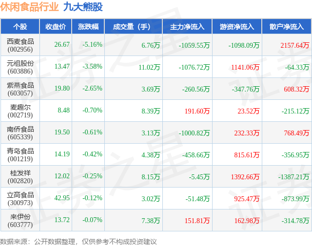 个股表现方面,休闲食品行业当日领跌股为西麦食品(002956),该股当日报收26.67,下跌5.16%,成交量6.76万,主力资金净流出1059.55万元。元祖股份(603886)以下跌3.58%紧随其后,该股当日成交量11.02万,主力资金净流出1076.72万元。除此之外,紫燕食品(603057)、麦趣尔(002719)、南侨食品(605339)均进入当日熊股之列。具体个股列表见下表: