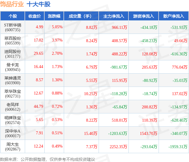 个股表现方面,饰品行业当日领涨股为ST新华锦(600735),该股当日报收4.99,上涨5.05%,成交量8.82万,主力资金净流入966.11万元。菜百股份(605599)以上涨3.97%紧随其后,该股当日成交量8.24万,主力资金净流入408.57万元。除此之外,迪阿股份(301177)、曼卡龙(300945)、莱绅通灵(603900)均进入当日牛股之列。具体个股列表见下表: