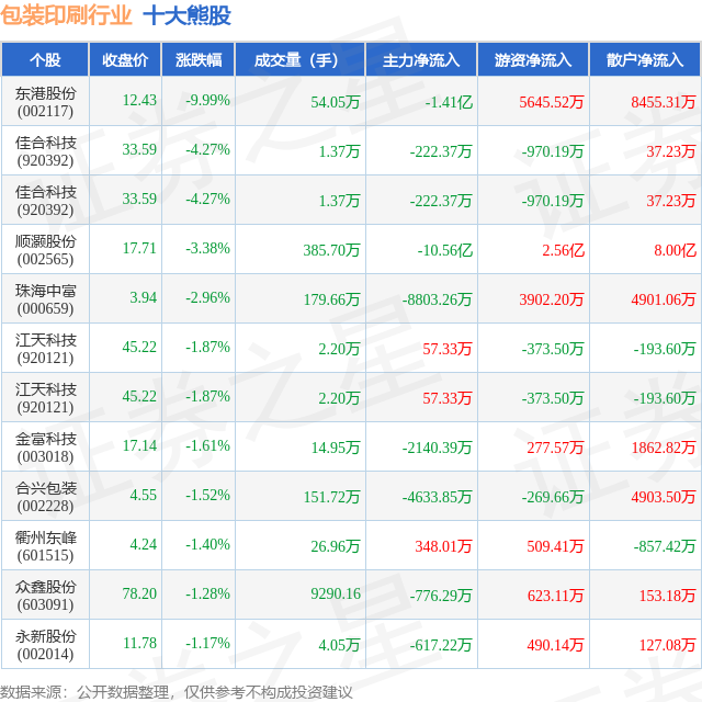 个股表现方面,包装印刷行业当日领跌股为东港股份(002117),该股当日报收12.43,下跌9.99%,成交量54.05万,主力资金净流出1.41亿元。佳合科技(920392)以下跌4.27%紧随其后,该股当日成交量1.37万,主力资金净流出222.37万元。除此之外,佳合科技(920392)、顺灏股份(002565)、珠海中富(000659)均进入当日熊股之列。具体个股列表见下表: