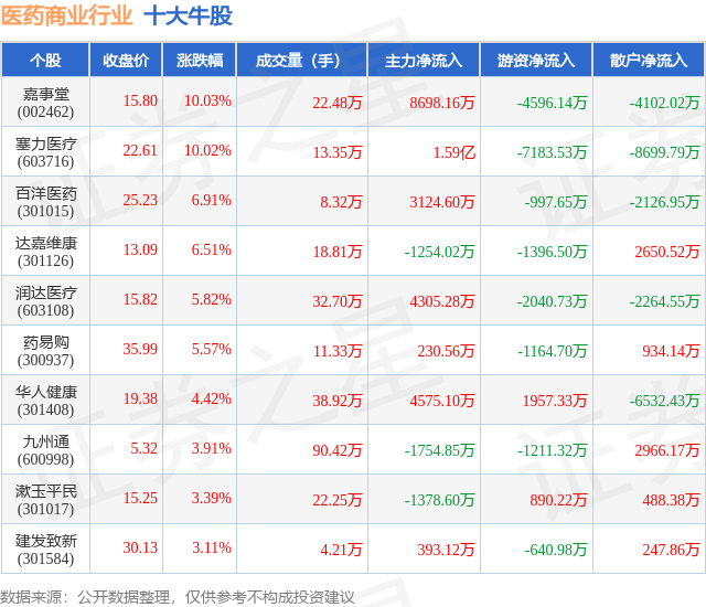 个股表现方面,医药商业行业当日领涨股为嘉事堂(002462),该股当日报收15.8,上涨10.03%,成交量22.48万,主力资金净流入8698.16万元。塞力医疗(603716)以上涨10.02%紧随其后,该股当日成交量13.35万,主力资金净流入1.59亿元。除此之外,百洋医药(301015)、达嘉维康(301126)、润达医疗(603108)均进入当日牛股之列。具体个股列表见下表: