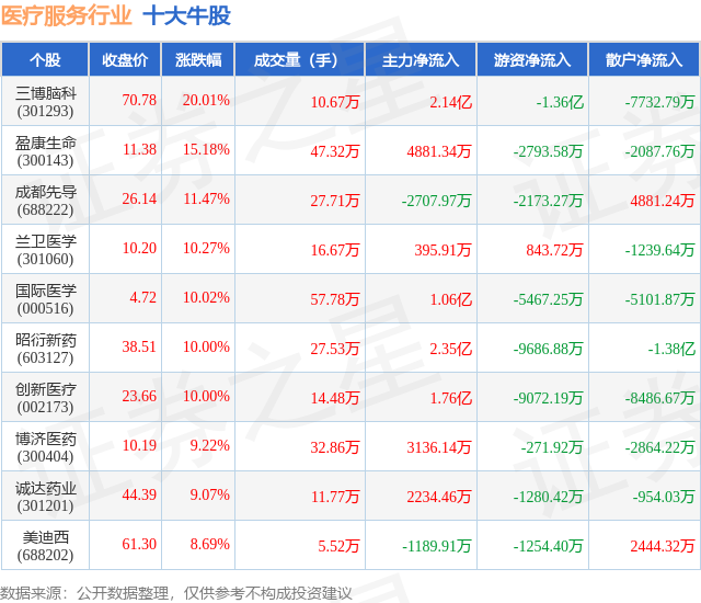 个股表现方面,医疗服务行业当日领涨股为三博脑科(301293),该股当日报收70.78,上涨20.01%,成交量10.67万,主力资金净流入2.14亿元。盈康生命(300143)以上涨15.18%紧随其后,该股当日成交量47.32万,主力资金净流入4881.34万元。除此之外,成都先导(688222)、兰卫医学(301060)、国际医学(000516)均进入当日牛股之列。具体个股列表见下表: