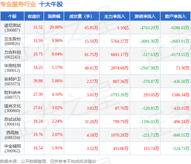 个股表现方面,专业服务行业当日领涨股为谱尼测试(300887),该股当日报收11.52,上涨20.0%,成交量65.85万,主力资金净流入1.1亿元。兰生股份(600826)以上涨9.96%紧随其后,该股当日成交量15.5万,主力资金净流入5764.37万元。除此之外,力合科创(002243)、华测检测(300012)、安邦护卫(603373)均进入当日牛股之列。具体个股列表见下表: