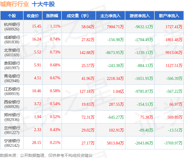 个股表现方面,城商行行业当日领涨股为杭州银行(600926),该股当日报收15.45,上涨1.11%,成交量58.04万,主力资金净流入7904.71万元。成都银行(601838)以上涨0.74%紧随其后,该股当日成交量27.82万,主力资金净流出156.98万元。除此之外,北京银行(601169)、贵阳银行(601997)、青岛银行(002948)均进入当日牛股之列。具体个股列表见下表: