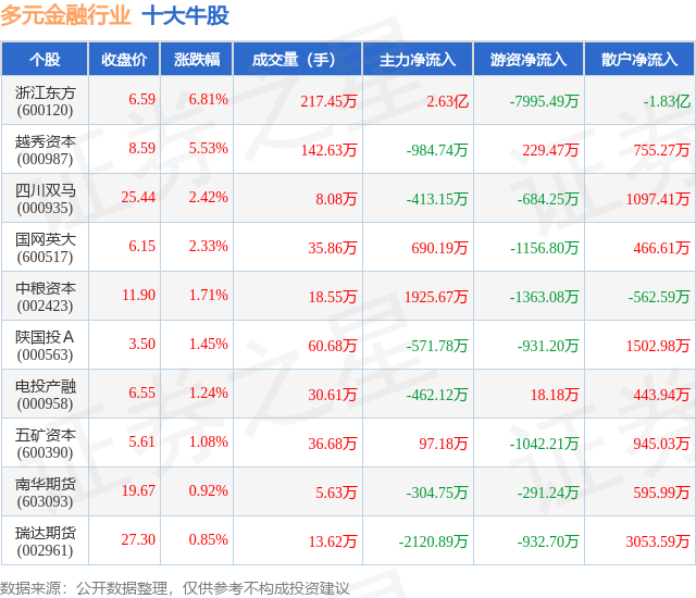 个股表现方面,多元金融行业当日领涨股为浙江东方(600120),该股当日报收6.59,上涨6.81%,成交量217.45万,主力资金净流入2.63亿元。越秀资本(000987)以上涨5.53%紧随其后,该股当日成交量142.63万,主力资金净流出984.74万元。除此之外,四川双马(000935)、国网英大(600517)、中粮资本(002423)均进入当日牛股之列。具体个股列表见下表: