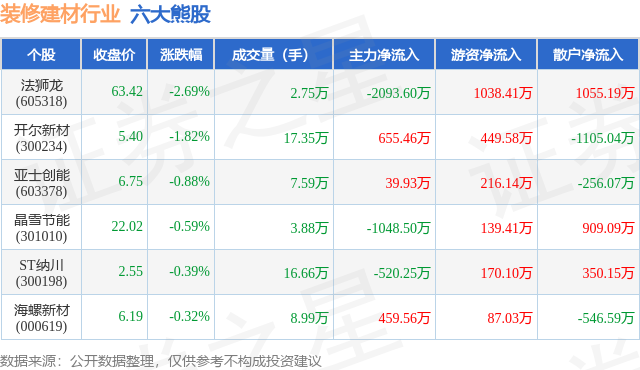 个股表现方面,装修建材行业当日领跌股为法狮龙(605318),该股当日报收63.42,下跌2.69%,成交量2.75万,主力资金净流出2093.6万元。开尔新材(300234)以下跌1.82%紧随其后,该股当日成交量17.35万,主力资金净流入655.46万元。除此之外,亚士创能(603378)、晶雪节能(301010)、ST纳川(300198)均进入当日熊股之列。具体个股列表见下表: