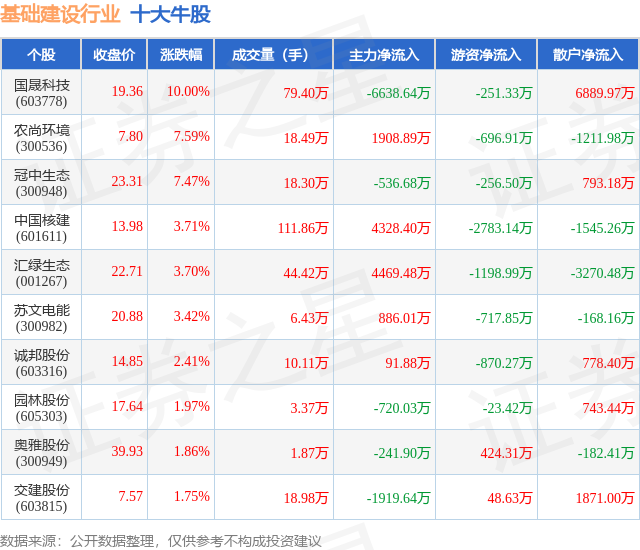 个股表现方面,基础建设行业当日领涨股为国晟科技(603778),该股当日报收19.36,上涨10.0%,成交量79.4万,主力资金净流出6638.64万元。农尚环境(300536)以上涨7.59%紧随其后,该股当日成交量18.49万,主力资金净流入1908.89万元。除此之外,冠中生态(300948)、中国核建(601611)、汇绿生态(001267)均进入当日牛股之列。具体个股列表见下表: