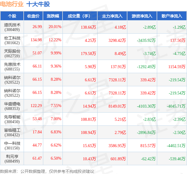 个股表现方面,电池行业当日领涨股为道氏技术(300409),该股当日报收26.99,上涨20.01%,成交量138.66万,主力资金净流入4.18亿元。宏工科技(301662)以上涨12.22%紧随其后,该股当日成交量4.25万,主力资金净流入3298.42万元。除此之外,天际股份(002759)、先惠技术(688155)、纳科诺尔(920522)均进入当日牛股之列。具体个股列表见下表: