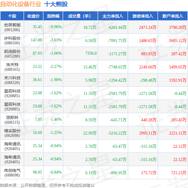 个股表现方面,自动化设备行业当日领跌股为宏英智能(001266),该股当日报收35.45,下跌9.96%,成交量18.72万,主力资金净流出6261.44万元。步科股份(688160)以下跌3.61%紧随其后,该股当日成交量6.58万,主力资金净流出7091.75万元。除此之外,凯迪股份(605288)、埃夫特(688165)、禾川科技(688320)均进入当日熊股之列。具体个股列表见下表: