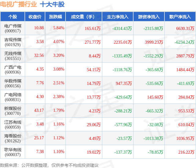 个股表现方面,电视广播行业当日领涨股为电广传媒(000917),该股当日报收10.88,上涨5.84%,成交量165.61万,主力资金净流出4314.43万元。吉视传媒(601929)以上涨4.07%紧随其后,该股当日成交量271.77万,主力资金净流入2235.01万元。除此之外,无线传媒(301551)、广西广电(600936)、华数传媒(000156)均进入当日牛股之列。具体个股列表见下表: