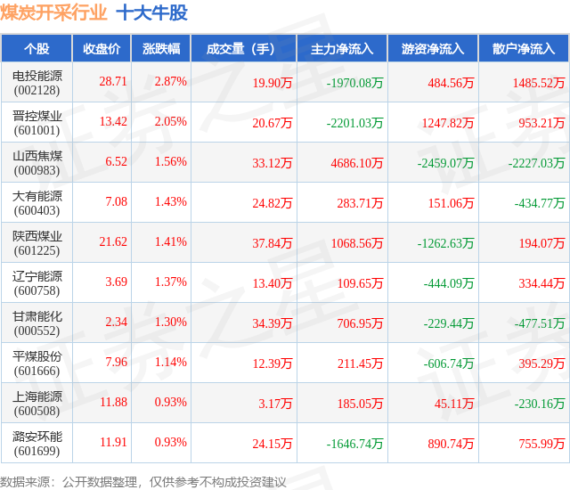 个股表现方面,煤炭开采行业当日领涨股为电投能源(002128),该股当日报收28.71,上涨2.87%,成交量19.9万,主力资金净流出1970.08万元。晋控煤业(601001)以上涨2.05%紧随其后,该股当日成交量20.67万,主力资金净流出2201.03万元。除此之外,山西焦煤(000983)、大有能源(600403)、陕西煤业(601225)均进入当日牛股之列。具体个股列表见下表: