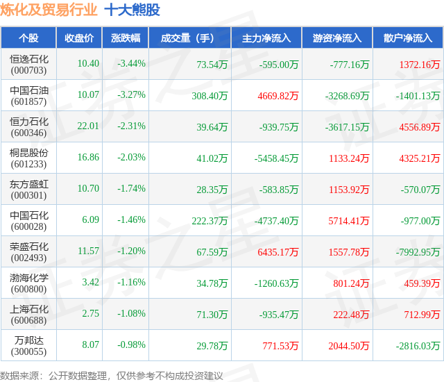 个股表现方面,炼化及贸易行业当日领跌股为恒逸石化(000703),该股当日报收10.4,下跌3.44%,成交量73.54万,主力资金净流出595.0万元。中国石油(601857)以下跌3.27%紧随其后,该股当日成交量308.4万,主力资金净流入4669.82万元。除此之外,恒力石化(600346)、桐昆股份(601233)、东方盛虹(000301)均进入当日熊股之列。具体个股列表见下表: