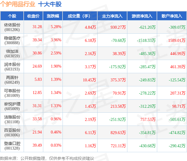 个股表现方面,个护用品行业当日领涨股为依依股份(001206),该股当日报收31.28,上涨5.28%,成交量4.84万,主力资金净流入930.27万元。稳健医疗(300888)以上涨3.96%紧随其后,该股当日成交量6.18万,主力资金净流出70.68万元。除此之外,倍加洁(603059)、润本股份(603193)、两面针(600249)均进入当日牛股之列。具体个股列表见下表: