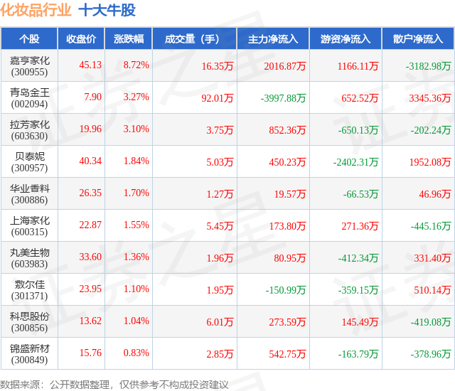 个股表现方面,化妆品行业当日领涨股为嘉亨家化(300955),该股当日报收45.13,上涨8.72%,成交量16.35万,主力资金净流入2016.87万元。青岛金王(002094)以上涨3.27%紧随其后,该股当日成交量92.01万,主力资金净流出3997.88万元。除此之外,拉芳家化(603630)、贝泰妮(300957)、华业香料(300886)均进入当日牛股之列。具体个股列表见下表: