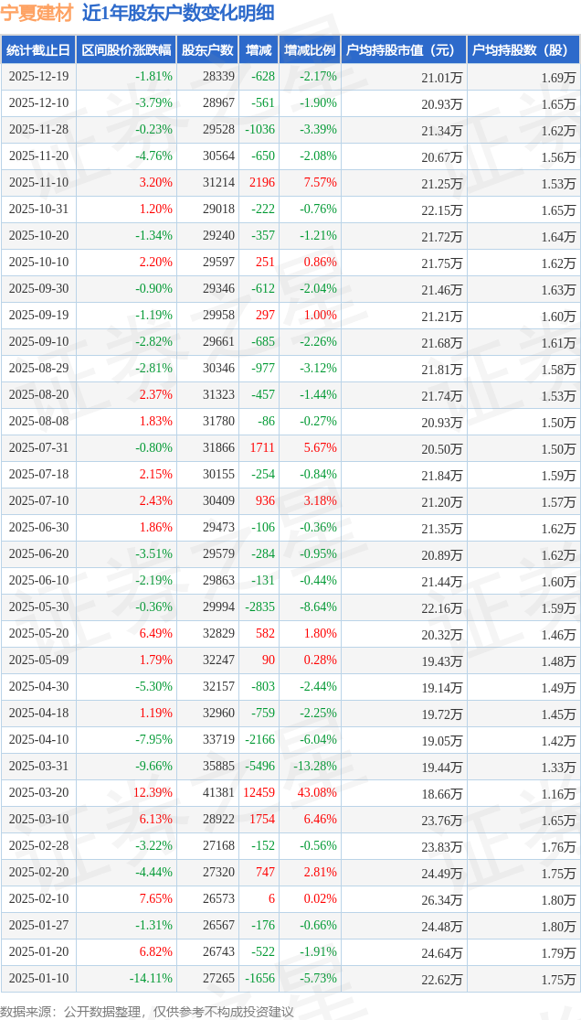 从股价来看,2025年12月10日至2025年12月19日,宁夏建材区间跌幅为1.81%,在此期间股东户数减少628.0户,减幅为2.17%。
