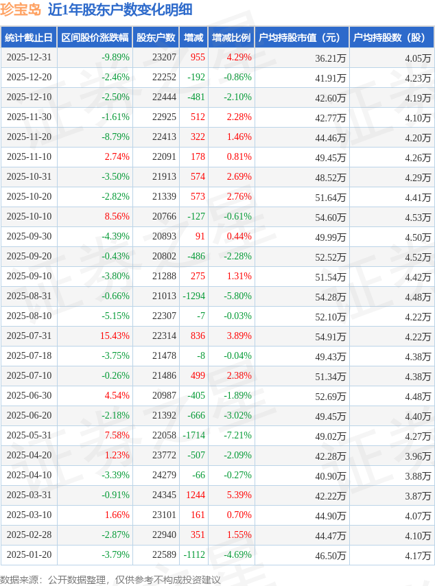 从股价来看,2025年12月20日至2025年12月31日,珍宝岛区间跌幅为9.89%,在此期间股东户数增加955.0户,增幅为4.29%。