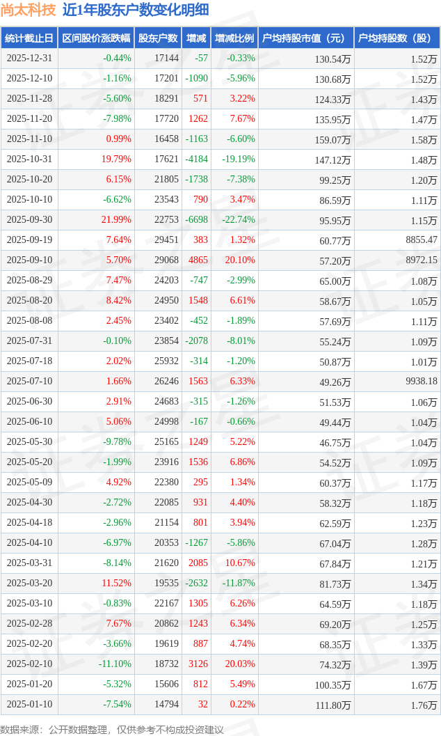 从股价来看,2025年12月10日至2025年12月31日,尚太科技区间跌幅为0.44%,在此期间股东户数减少57.0户,减幅为0.33%。