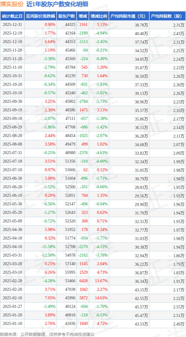 证券之星消息,近日博实股份披露,截至2025年12月31日公司股东户数为4.43万户,较12月19日增加2161.0户,增幅为5.13%。户均持股数量由上期的2.43万股减少至2.31万股,户均持股市值为38.78万元。