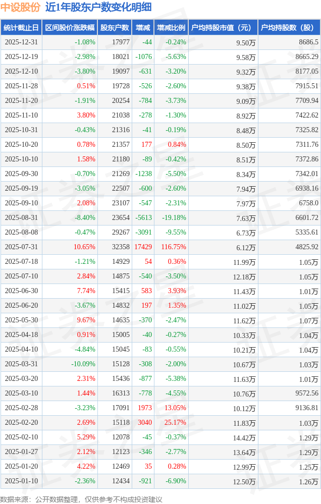 从股价来看,2025年12月19日至2025年12月31日,中设股份区间跌幅为1.08%,在此期间股东户数减少44.0户,减幅为0.24%。