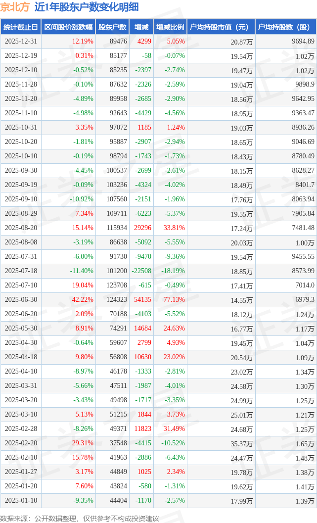 从股价来看,2025年12月19日至2025年12月31日,京北方区间涨幅为12.19%,在此期间股东户数增加4299.0户,增幅为5.05%。