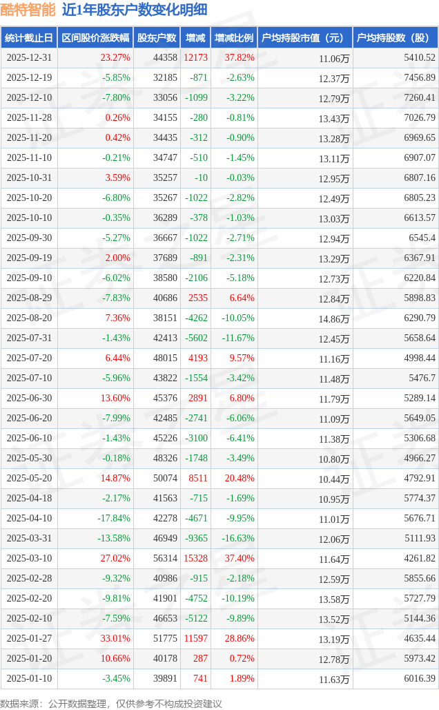 从股价来看,2025年12月19日至2025年12月31日,酷特智能区间涨幅为23.27%,在此期间股东户数增加1.22万户,增幅为37.82%。