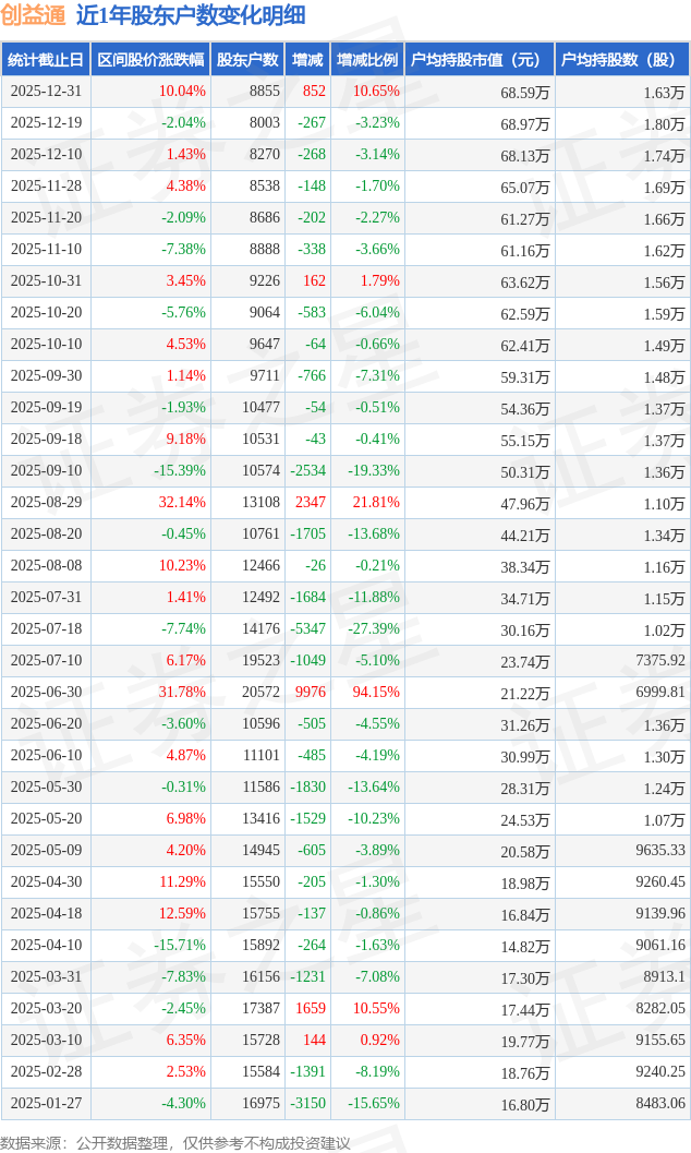 从股价来看,2025年12月19日至2025年12月31日,创益通区间涨幅为10.04%,在此期间股东户数增加852.0户,增幅为10.65%。