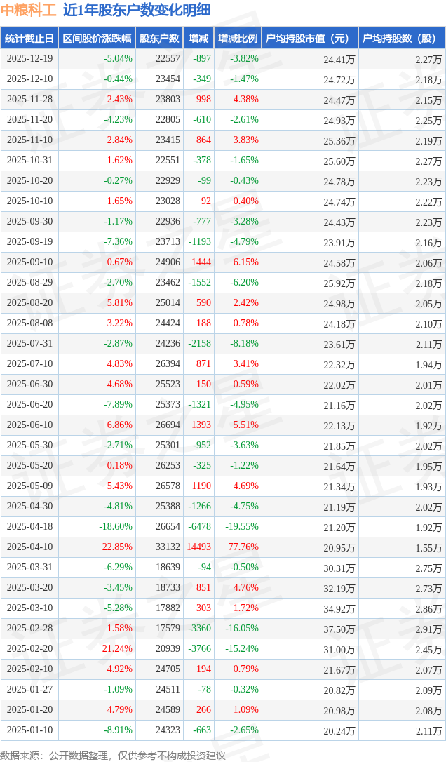 从股价来看,2025年12月10日至2025年12月19日,中粮科工区间跌幅为5.04%,在此期间股东户数减少897.0户,减幅为3.82%。
