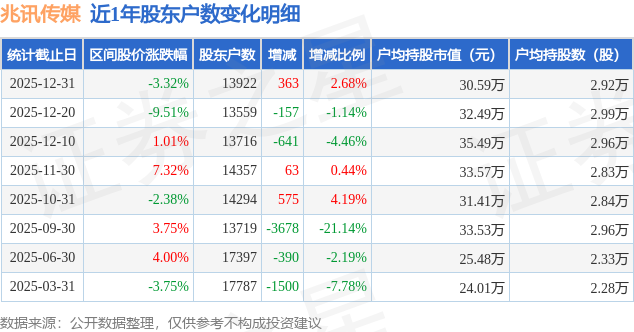 从股价来看,2025年12月20日至2025年12月31日,兆讯传媒区间跌幅为3.32%,在此期间股东户数增加363.0户,增幅为2.68%。
