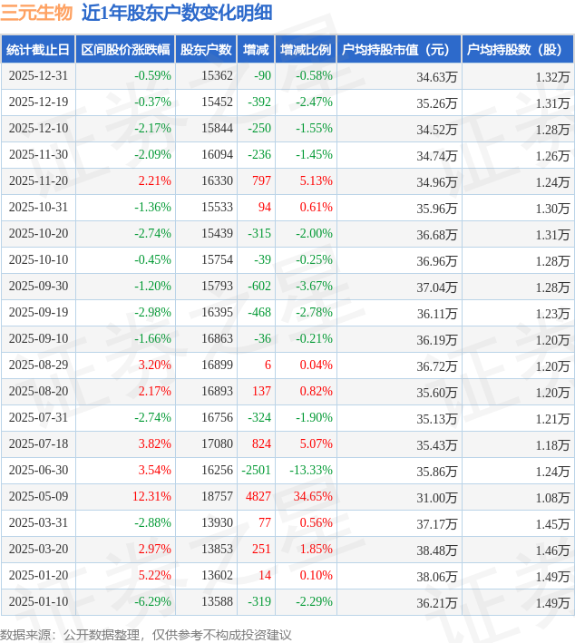 从股价来看,2025年12月19日至2025年12月31日,三元生物区间跌幅为0.59%,在此期间股东户数减少90.0户,减幅为0.58%。