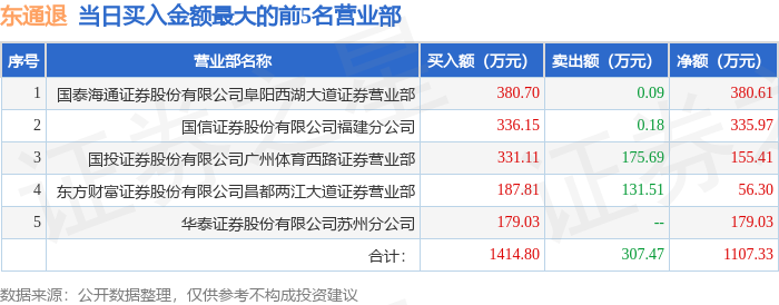 证券之星消息,沪深交易所2026年1月5日公布的交易公开信息显示,东通退(300379)因退市整理期登上龙虎榜。此次是近5个交易日内第3次上榜。