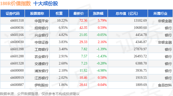 证券之星消息,1月5日,180R价值(000031)指数报收于3290.02点,涨0.95%,成交2059.95亿元,换手率0.48%。当日该指数成份股中,上涨的有99家,兆易创新以10.0%的涨幅领涨,下跌的有28家,浦发银行以4.98%的跌幅领跌。