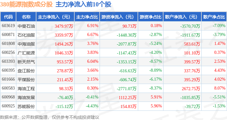 资金流向方面,380能源(000104)指数成份股当日主力资金净流入合计3648.83万元,游资资金净流出合计6079.79万元,散户资金净流入合计2430.97万元。成份股资金流向详情见下表: