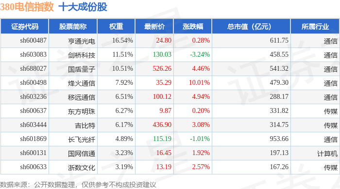 证券之星消息,1月5日,380电信(000112)指数报收于6300.38点,涨2.09%,成交216.0亿元,换手率2.69%。当日该指数成份股中,上涨的有18家,烽火通信以10.01%的涨幅领涨,下跌的有4家,剑桥科技以3.24%的跌幅领跌。