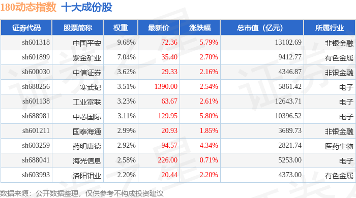 证券之星消息,1月5日,180动态(000123)指数报收于7372.82点,涨3.14%,成交2394.55亿元,换手率1.2%。当日该指数成份股中,上涨的有79家,中微公司以14.16%的涨幅领涨,下跌的有10家,浦发银行以4.98%的跌幅领跌。