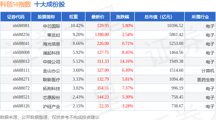 科创50(000688)指数十大成份股详情如下: