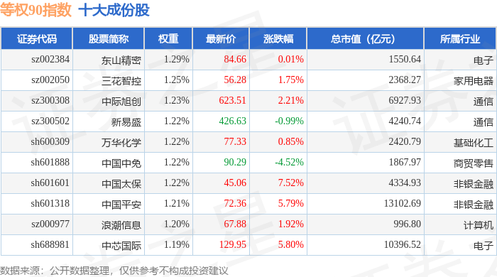 证券之星消息,1月5日,等权90(000971)指数报收于3425.75点,涨1.98%,成交3788.59亿元,换手率0.5%。当日该指数成份股中,上涨的有74家,中微公司以14.16%的涨幅领涨,下跌的有14家,中国中免以4.52%的跌幅领跌。