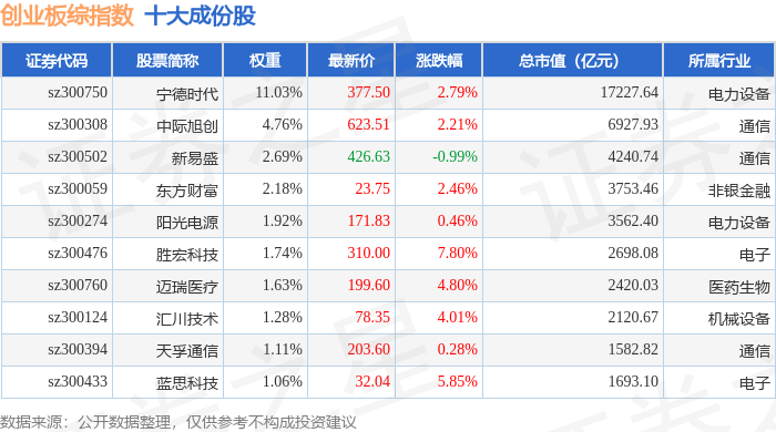 创业板综(399102)指数十大成份股详情如下: