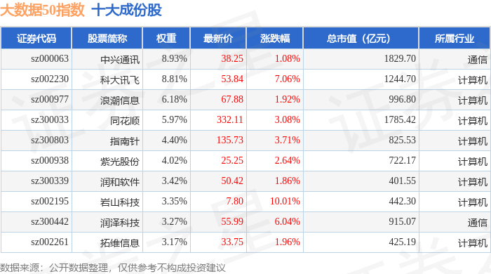 大数据50(399282)指数十大成份股详情如下: