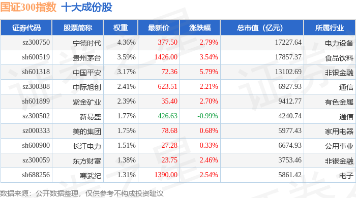 国证300(399312)指数十大成份股详情如下: