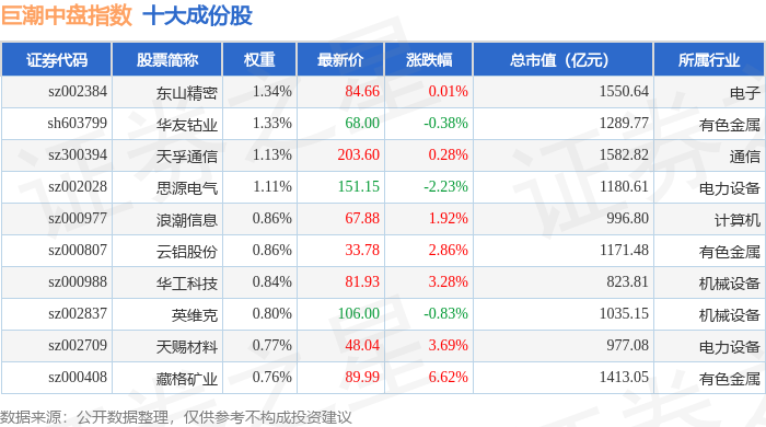 巨潮中盘(399315)指数十大成份股详情如下: