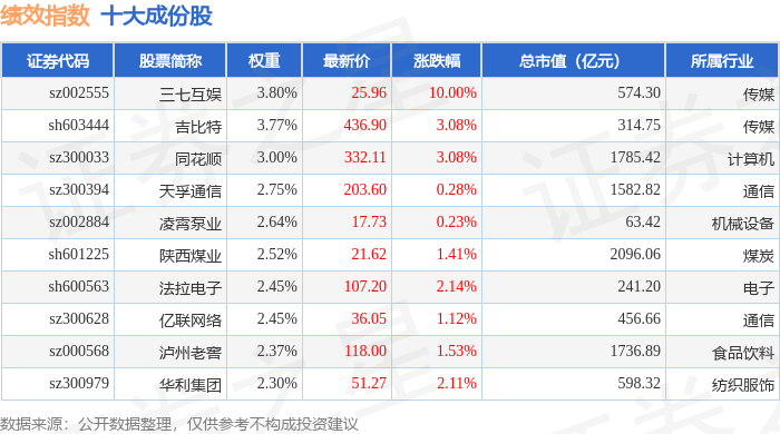 证券之星消息,1月5日,绩效指数(399398)报收于10818.99点,涨2.1%,成交790.0亿元,换手率0.89%。当日该指数成份股中,上涨的有86家,三七互娱以10.0%的涨幅领涨,下跌的有14家,罗莱生活以4.58%的跌幅领跌。
