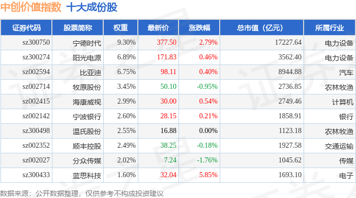 中创价值(399627)指数十大成份股详情如下: